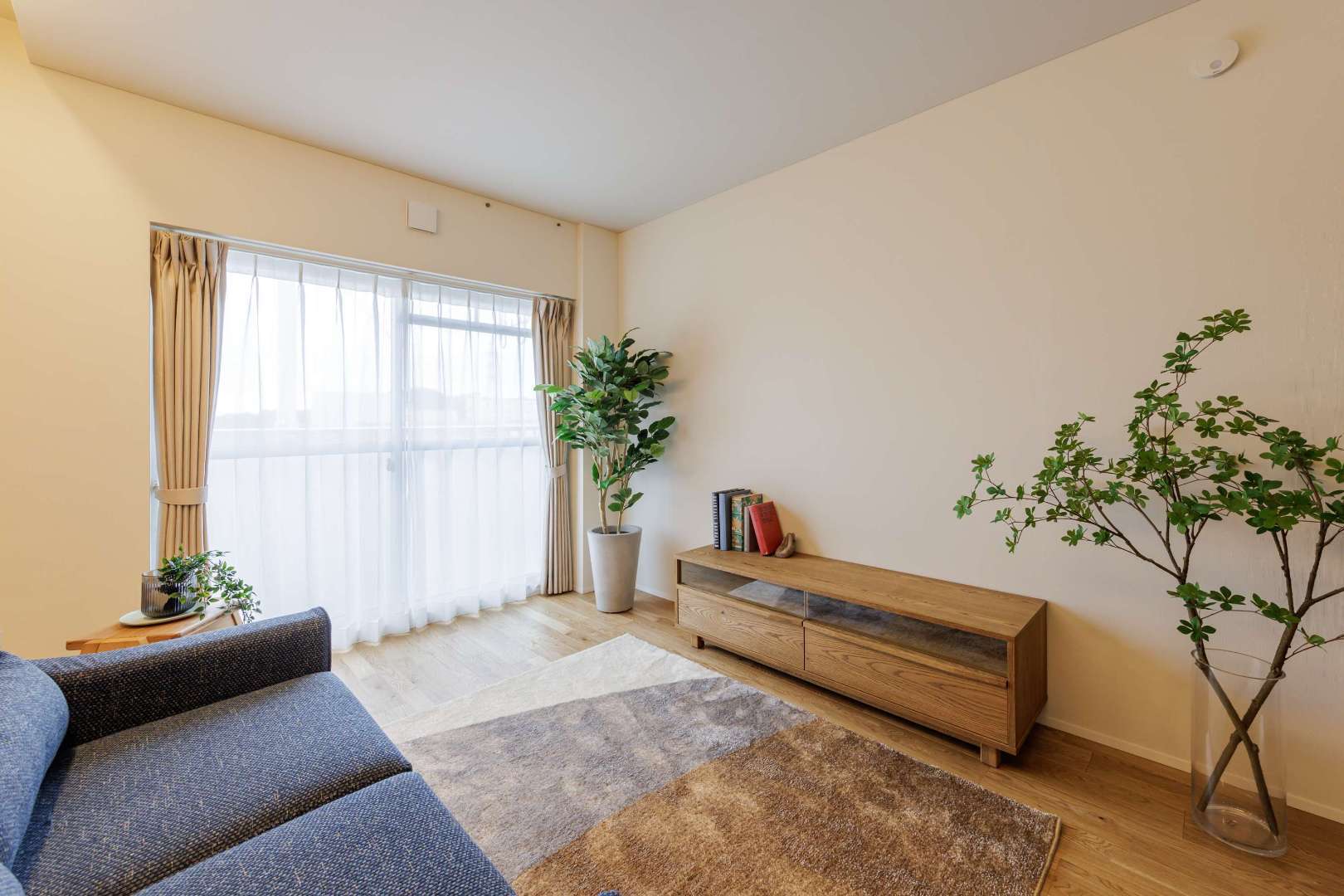リビング:温かみのある木材を使用したローテーブルと、ナチュラルカラーのソファを配置。シンプルでありながら、家族がリラックスできる落ち着いた空間を作り出しました。